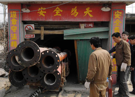 3月29日,在西石門鐵礦北采區,救援人員正準備將救援設備運往井下。