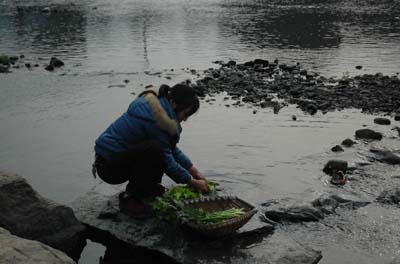 位于秀山縣溶溪鎮的溶溪河畔,附近的一位居民正在河里洗菜。河水雖然是清澈的,但河床是黑的,原因是大量的錳渣沉積在河底。(新華社記者 徐旭忠 攝)