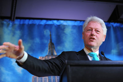 圖為美國前總統克林頓在帝國大廈節能改造新聞發布會上發言。