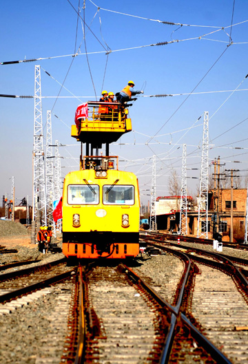 國家重點工程、內蒙古自治區境內首條電氣化鐵路——大同至包頭(簡稱大包線)鐵路電氣化改造工程目前進入最后攻堅階段。大包線建成開通后,對緩解我國北部鐵路煤炭運能不足的緊張狀況,加速內蒙古西部地區煤炭基地的開發具有重要意義。圖為中鐵電氣化局一公司的工人正在呼和浩特西貨站架設電纜。