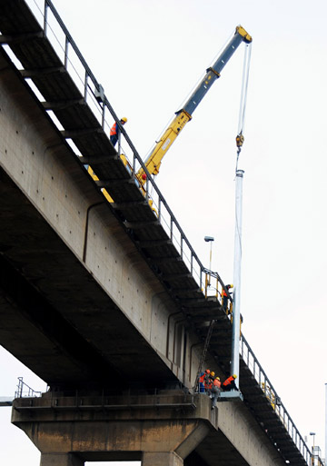 4月13日,中鐵電氣化局的施工人員在江西九江長江大橋鐵路南引橋上行線吊裝橋鋼柱。當日,京九鐵路電氣化工程九江長江大橋鐵路橋改造開始全面立桿。九江長江大橋鐵路橋改造是京九鐵路電氣化工程的重點控制性工程。于2008年8月全面啟動的電氣化改造工程總投資76億多元。 (新華社發)