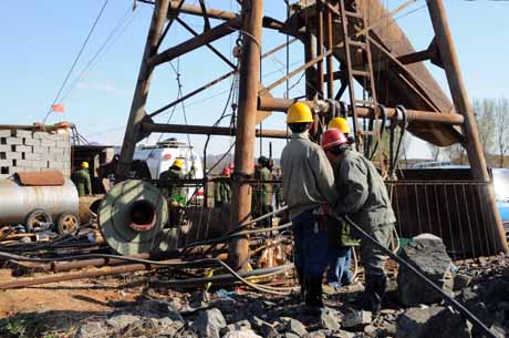 4月14日11時,河北省遵化市西三里鄉胡莊子村一非法鐵礦發生透水,6人被困井下。接報后,唐山市以及遵化市立即啟動應急預案,迅速組織專業隊伍趕赴現場,搶救被困人員。據初步調查,該礦屬非法礦井。礦主及相關人員已被公安部門控制,接受訊問。事故原因正在調查中。圖為救援人員正在井口抽水。