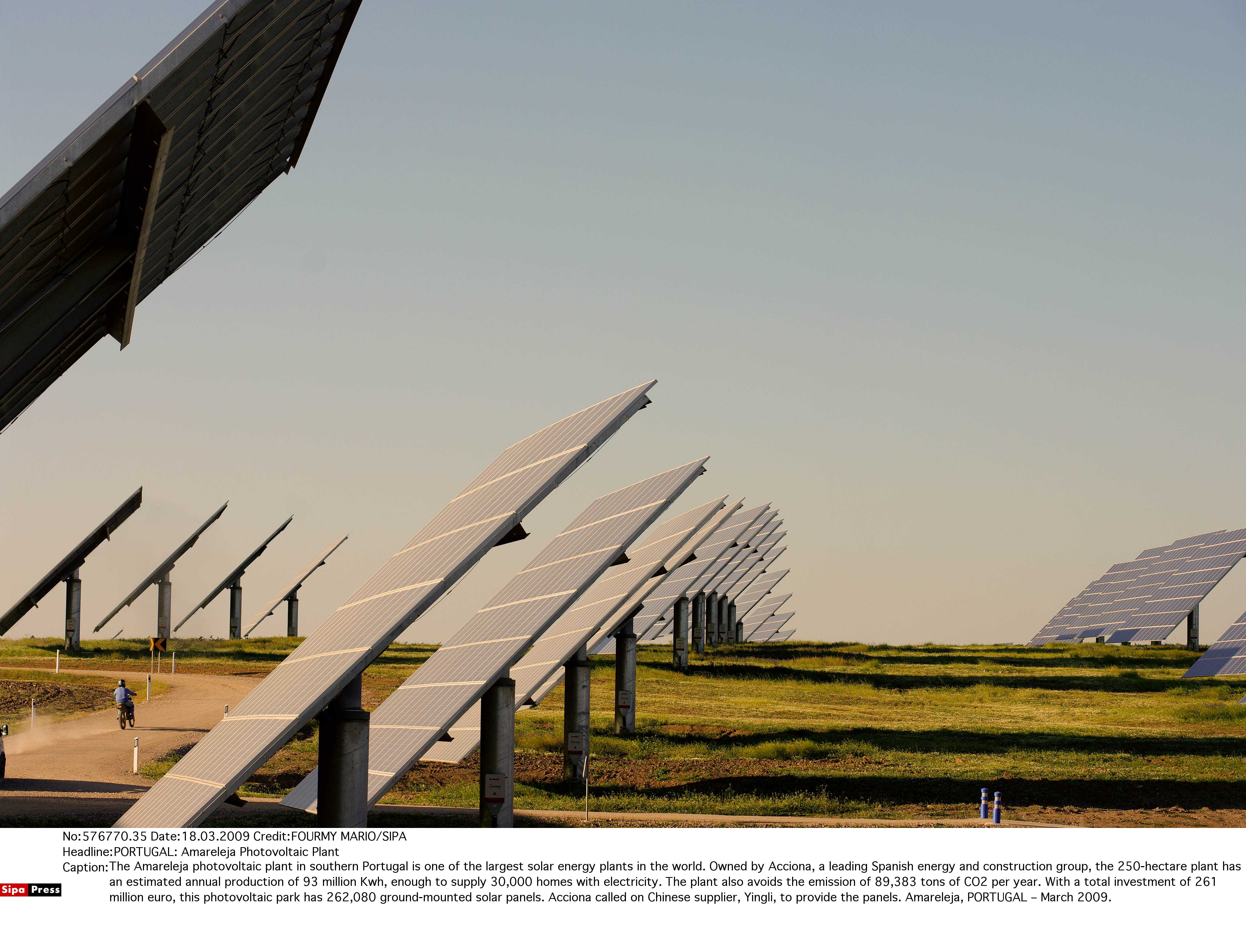 葡萄牙阿馬雷萊雅太陽能發電廠。占地250公頃的阿馬雷萊雅太陽能發電廠是世界上最大的太陽能發電廠之一,預計年發電量為9300萬千瓦,可供3萬個家庭用電。該廠每年可減少二氧化碳排量89383噸。新華社/西霸