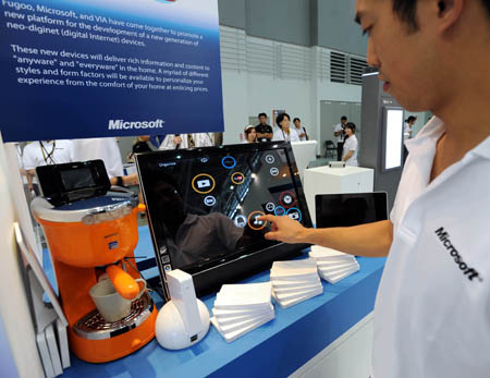 在日前舉行的臺北國際電腦展上,工作人員展示微軟公司開發的一款新產品,用戶可通過電話或電腦控制咖啡機,自動沖泡咖啡。