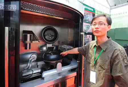 6月14日,2009中國北京國際節能環保展覽會開幕。本屆展覽的主題是“綠色產業、綠色消費”。圖為一名工作人員在介紹一臺名為“烹飪機器人”的機器。