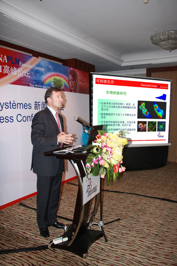 達索系統全球總裁兼執行長伯納德·查爾斯在西安“2009大中華區PLM高峰論壇”上演講虛擬制造技術如何進入生物智能研究領域。本報記者