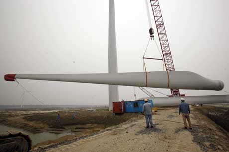 工人們正在江蘇如東風電特許權二期項目吊裝電機組的葉片。位于江海交匯處的江蘇如東,擁有106公里長的海岸線。區內灘涂廣闊,周圍環境空曠,沿海年可供發電有效風時近8000小時。新華社記者