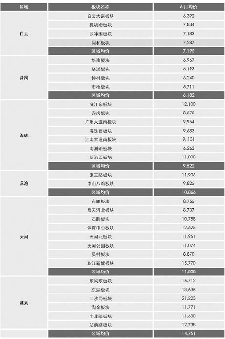 廣州市各區域、各板塊均價(單位:元/平方米) |