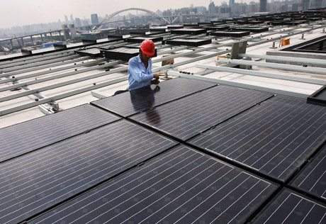 工人在上海世博會中國館頂層安裝太陽能電池板。據現場工程技術人員介紹,這些太陽能電池板每塊面積約為1.3平方米,共計1264塊,在陽光充足的理想條件下,每小時能為中國館供電約300千瓦時。新華社發 |