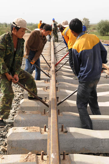 新疆喀(什)——和(田)鐵路8月9日正式鋪軌。新華社記者周文杰 攝