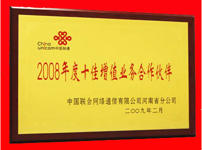 英泰利智榮獲河南聯通“2008年度十佳增值業務合作伙伴”