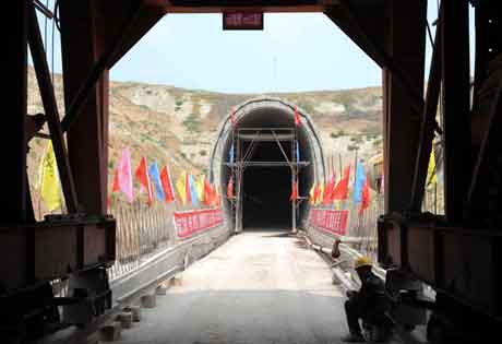 阿貴廟山隧道位于內蒙古巴林右旗境內,全長2960米,投資7000多萬元。它穿越松軟的沙土地帶,氣候惡劣,地質情況極為復雜,六級圍巖達到680米,施工難度屬國內罕見。500多名施工技術人員經過16個月的奮戰,探索沙地隧道施工的新技術,有效解決了土質沙干、穩定性和承載力差的難題,為我國沙漠地區隧道施工創造了寶貴的經驗。巴新鐵路設計技術標準為國鐵Ⅱ級,預留Ⅰ級條件;正線單線,預留雙線條件;牽引種類為內燃,預留電氣化條件;牽引數量4000噸,全線共設45個車站,初期開設25個車站。遠景運輸能力5000萬噸,客車2對,工程總投資74.2億元。工程建設期為3年,計劃2010年底左右全線開通運營。