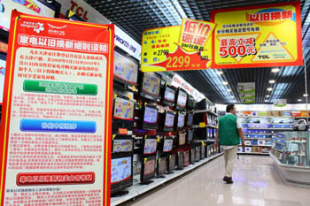 日前,天津市全面展開家電以舊換新工作。據天津市商務委有關負責人介紹,家電銷售企業和回收企業已經通過招標方式確定向社會公布,消費者可在交售舊家電購買新家電時享受家電補貼。此次列入家電以舊換新補貼產品范圍的品種有電視機、電冰箱,洗衣機、空調、電腦。圖為天津一家電賣場在顯著位置擺放家電以舊換新宣傳展板。 新華社發