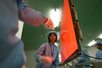 長虹新型等離子顯示屏后端工序專注的員工。(資料照片) |