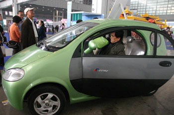 10月30日,在南京舉行的名特優新產品展銷會上,觀眾在觀看現場展銷的一款最高時速70公里、可連續行駛120公里的電動汽車。新華社發(董金林攝) |