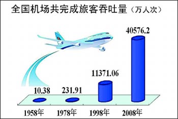 60年光陰荏苒,幾乎從零開始的新中國民航業總規模已躍居為世界第二。 據統計,到2005年,中國民航實現了運輸總周轉量257.765億噸公里,位列國際民航組織所有締約國的第二名。至2008年,中國民航實現運輸總周轉量376.8億噸公里,是1950年的24000倍,全行業擁有運輸飛機1259架,機隊規模60年增長200倍。開通國內航線1235條,國際航線開通了至47個國家、108個城市的297條定期客貨航線,首都國際機場已躋身世界機場第8位,成為世界繁忙的進出港之一。 60年一個輪回,中國民航業又站在新的關口,面臨新的挑戰。