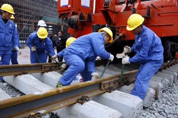 11月18日,鐵路建設者在漢宜高速鐵路宜昌段施工現場鋪軌。當日,漢宜高速鐵路開始鋪軌。漢宜高速鐵路東起漢口,西接宜昌,是我國“四縱四橫”鐵路主干網絡中滬漢蓉高速客運專線的一部分,為國家一級雙線電氣化鐵路,設計時速200公里。該鐵路將于2011年底全部竣工,屆時坐火車不到2小時便可從武漢到達宜昌。新華社發(文振效 攝)