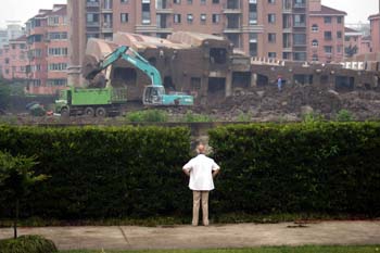 一位上海市民站在倒塌的“蓮花河畔景苑”樓盤前。新華社發 |