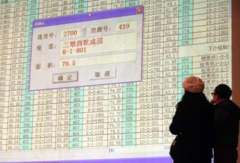 1月10日,選房的杭州市民在大屏幕前挑選經濟適用房。 當日,杭州新年第一次經濟適用房公開選房在杭州藝術學校舉行。據了解,本期經濟適用房房源總計套數600套,總建筑面積4.03萬平方米,主要分布在丁橋和三墩。新華社發 |