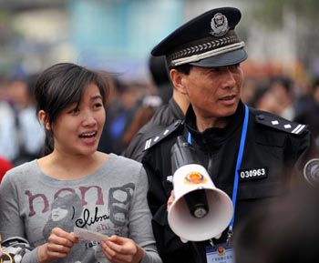 2月2日,一位鐵路公安部門工作人員(右)在廣州火車站廣場引導旅客。 據鐵路部門統計,廣鐵春運前3天共發送旅客167萬人次,客流呈現規律性波動。為滿足即將到來的高峰期客流需求,廣鐵將逐步增開臨客。新華社記者
