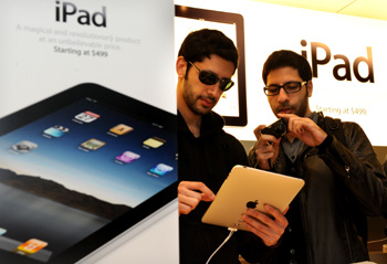4月3日,兩位顧客在位于紐約曼哈頓第五大道的蘋果專賣店體驗iPad。新華社記者 申宏