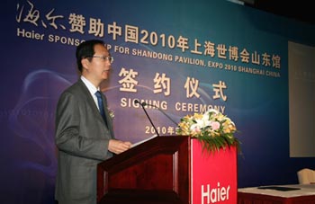 3月27日,山東省政府副秘書長韓金峰為海爾贊助世博山東館致辭。 |