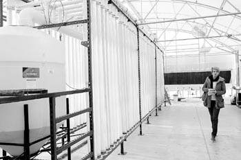 美國大力發展海藻生物能源技術。2月1日,在美國肯塔基州列克星敦的肯塔基州大學應用能源研究中心,一名記者從海藻種子反應器旁走過。新華社記者 劉欣 攝