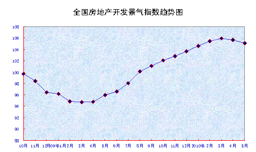 5月份,全國房地產開發景氣指數(簡稱“國房景氣指數”)為105.07,比4月份回落0.59點,比去年同期提高9.13點。