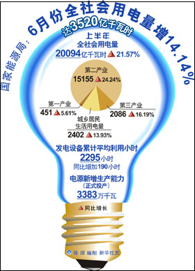 6月份,全社會用電量3520億千瓦時,同比增長14.14%,增速比5月份下降6.66個百分點,環比增長1.1%。1至6月,全社會用電量20094億千瓦時,同比增長21.57%。從分類用電量看,第一產業451億千瓦時,增長5.61%;第二產業15155億千瓦時,增長24.24%;第三產業2086億千瓦時,增長16.19%;城鄉居民生活用電2402億千瓦時,增長13.93%。 記者注意到,單月同比增長14.14%是今年各月同比增速中最緩的,今年前5個月已經連續維持了20%以上的同比增速。 國家電網能源研究院副院長胡兆光表示,從6月的用電量增速減緩看來,我國經濟正在做一個理性的回歸,“之前連續數月20%以上的增速在歷史上是罕見的,去年上半年的基數較低是主要原因,在中央一攬子計劃刺激下,2009年6月用電量同比增速正式轉正,所以會造成今年用電量增速前高后低的情況,”胡兆光告訴《經濟參考報》記者。 6月全社會用電量的同比增速是14.14%,胡兆光認為到今年底還會繼續釋放回歸,增速還會往下走!叭绻搅四甑状蠹野l現用電量月度增幅在2%至6%之間,也不要覺得奇怪和可怕,政府在金融危機期間做了一些大的手段調控使得用電量出現了較大的波幅,往后的增幅逐步減小正好表明了中國經濟逐步趨穩!焙坠庹f。 國家倡導并嚴格執行的節能減排政策被眾多專家認為是包括眾多高耗能行業在內的重工業用電量增速環比下降較多的一個重要原因。 華北電力大學校長助理張粒子教授告訴《經濟參考報》記者,“前一陣國家嚴格執行對高耗能企業的差別電價政策對重工業的用電量有一定影響,政府對一些高耗能產業的宏觀調控手段初見成效”。 中投顧問能源行業首席研究員姜謙認為,目前是實現“十一五”期間單位GDP能耗下降20%目標的關鍵時期,各部委相繼出臺多項舉措,對鋼鐵、有色、電力、建材、石化等重點行業,采用取消優惠電價、執行差別電價、加大對高耗能企業關停力度等多種手段加以抑制!按送,寧夏、四川、浙江等多個省區自6月1日起相繼取消對高耗能行業的優惠電價,由此必然導致區內高耗能企業減少用電量。這也是6月份全國重工業用電量同比增速大幅回落的重要因素!苯t告訴《經濟參考報》記者。 電監會研究室的吳疆研究員提醒《經濟參考報》記者,不要光看重工業的用電量增速減緩這一個數據,“重工業用電量絕對量和占全社會用電量比例的環比下降,更可以說明一些問題! 記者比較了5月份的《全國電力工業統計數據》,在6月份全國全社會用電量、第一產業、輕工業、第三產業、城鄉居民生活全面較5月份正增長的情況下,6月的重工業用電量絕對量環比下降17億千瓦時,占全社會用電量比例環比下降1.22%。
