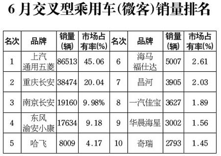 PV市場。 從6月份微客的銷售情況來看,排在前10名的品牌共銷售188124輛,占交叉型乘用車企業總銷量的98%。從排名情況看,排在前六名的品牌名次與上月沒有變化;奇瑞由上月的第七降為第十,華晨海星由上月的第八降為第九,昌河由上月的第九升為第七,上月第十的吉奧跌出十強,一汽佳寶進入十強,排名第八。 6月微客市場的最大特征是五菱系列的產銷回調,其產量已經低于2月的低位,長安的產銷量也是年度的次低點位置。而這兩家的零售同比增長是行業內最好的,其他廠家的壓力可想而知。前十名中僅有三個品牌(重慶長安、南京長安、東風渝安小康)銷量上升,其中重慶長安增速最快,為32.03%。其余均下降,奇瑞和華晨海星下降最快,分別為51.07%和30.19%。 如果把2009年的暴增體現為不合時宜的需求異常波動,那么未來微客市場的增長壓力會很大,新進入廠家的低銷量就是客觀的寫照。 |