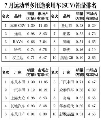 7月運動型多用途乘用車(SUV)銷售表現突出,銷售10.97萬輛,環比下降1.57%,同比增長86.63%,遠高出乘用車銷售平均水平。 7月份,在SUV銷量中,2.0L排量車型熱銷勢頭未退,所占比例為46%。其次是2.4L排量車型,銷量占比為20.76%。在其他車型環比均現不同程度的下滑后,SUV的環比增幅顯得較為搶眼,因此其也成為乘用車市場中產銷環比以及同比增幅最大的車型。 途觀是本月最大的看點,繼6月之后再次超越RAV4,驗證了途觀的表現并非曇花一現。漢蘭達、獅跑等車型,連續兩個月躋身SUV銷量第一梯隊,代表歐美車型在國內主流SUV市場爭得話語權。 與上月相比,SUV品牌前10位排名發生較大變化,僅有本田CRV保持不變,繼續保持第一。途觀、RAV4、圣達菲較上月上升一位,漢蘭達上升三位,哈弗、逍客、獅跑下降兩位,瑞虎和奧迪Q5進入前10,IX35和眾泰5008跌出前10。 SUV企業前10位排名沒有新進新出,但與上月相比,除了東風本田保持榜首不變外,其他各家名次均有變化;排名上升的有四家,其中廣汽豐田上升四位,一汽豐田、上海大眾上升兩位,奇瑞上升一位。排名下降的有五家,其中東風悅達起亞下降三位,長城汽車、東風日產下降兩位,眾泰汽車、華泰現代下降一位。 |