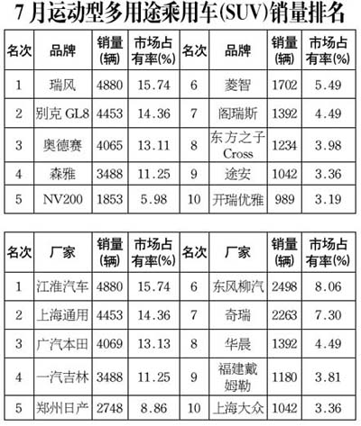 7月多功能乘用車(MPV)銷售3.10萬輛,環比下降10.10%,同比增長76.37%;其中2.0L、2.4L和1.8L排量車型銷量占比較大,銷量占比分別為24.01%、14.57%和14.19%。 與上月相比,除了東方之子Cross、開瑞優雅排名不變外,瑞風與別克GL8、奧德賽與森雅名次互換,菱智與途安闖入十強,普利馬與風行退出十強,NV200與閣瑞斯名次均上升兩位,分別由第七、第九上升至第五、第七。 7月瑞風表現最突出,較上月大增29.54%,超過GL8取得第一,GL8較上月下降13.82%,屈居第二;奧德賽較上月增長14.24%,取得第三,森雅表現不佳,較上月下降22.97%,退為第四;新品NV200較上月增長6.86%,閣瑞斯名次上升銷量下降,較上月下降15.28%;而處于高銷量后回落期的普利馬在上月環降27.22%后,7月無緣前10。 與上月相比,銷量排名前10位的MPV企業,除了奇瑞排名第七不變外,其它均有變化。前六位中,江淮汽車與上海通用,廣汽本田與一汽吉林,鄭州日產與東風柳汽名次互換,上海大眾憑借途安的表現闖入前十,海馬汽車退出十強,華晨與福建戴姆勒名次均上升一位,分別由第九、第十上升至第八、第九。 |