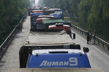 8月19日,堵在京藏高速河北省懷安縣境內的大車。新華社發(武殿森
