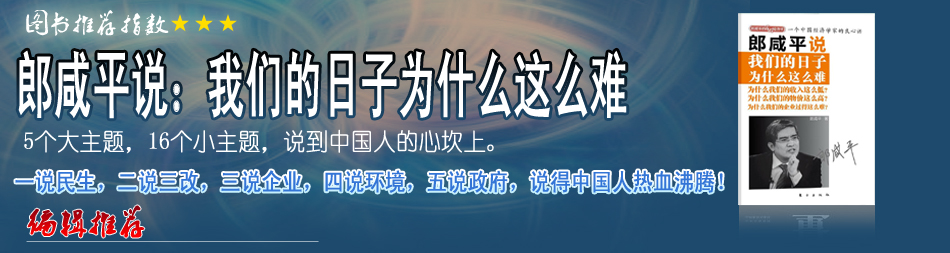 | 這本書還沒看完,就迫不及待的向大家推薦了。為什么中國人的收入那么低,為什么房改醫改那么難、為什么蔬菜那么貴……朗教授用經濟的眼光分析的非常透徹,也給出了些值得借鑒的發達國家的成功經驗。作為普通老百姓的我,看了這本書,覺得對自己的眼界提高了,同時,對自己未來的生活也有指導作用。 |
