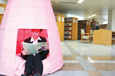 部分藝術品被置放在不起眼的角落。伴隨書香,在上海圖書館里與這些藝術品相遇令人意外。過道旁,一個粉紅圓帳篷,里面鋪著墊子,垂下一盞吊燈,這個溫馨小窩叫做“私人閱讀燈”,可以鉆進去看書、靜思。設計師林天苗說:“我在公共閱覽室看書很容易走神,非常想要一個私密的閱讀空間,于是就創造了這個作品!