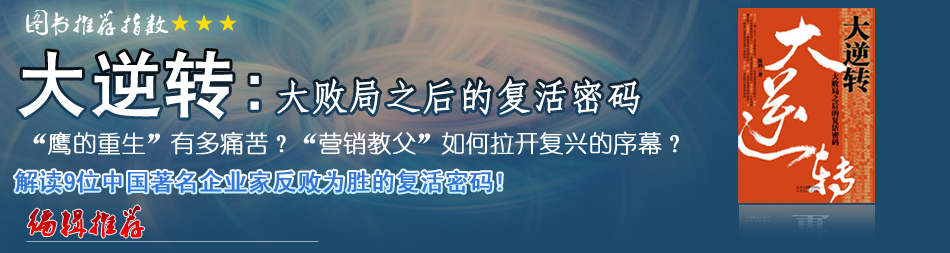 | 對于企業家而言,失敗只是華彩篇章中一個微不足道的逗號而已。財經作家陳潤在他的新書《大逆轉》中,就寫了這樣一群不甘心失敗、再戰商業江湖,又重新獲得人生輝煌的企業家群體。從書中對這些案例的分析總結,我們可以看見那些歷經慘敗卻又從地上爬起來的企業家們所普遍具有的特質,那就是:狂野的夢想、粗壯的神經、冷靜的反思以及縝密的計劃…[詳細] |
