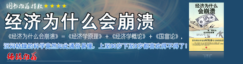 自高中時代以來,我就對經濟學十分感興趣。于是,滿懷期待地來到大學,希望對貨幣和經濟政策有所了解?墒俏业奶彀!我簡直不知道他們在學校里都教了我們什么,那些莫名其妙的術語讓人覺得極端無聊,某位古怪糊涂的教授滿嘴專業詞匯喃喃自語,除了這些,我回憶不起來任何有價值的東西……當我看到《經濟為什么會崩潰》一書時,非常興奮。迄今為止,還沒有哪本經濟學入門讀物能超越這本書。所有人都能在兩小時內讀完它,都能明白當今世界的貨幣政策和政府財政政策中的謬論,都清楚這些謬論正把我們引上毀滅之路。 |