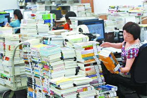 20日下午,工作人員在新首圖一層采編區內對購進的各種新書進行信息采集和分類,為接下來的上架工作做準備。孫戉攝 |