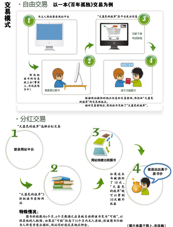 為嘗鮮,陳侃把一本《百年孤獨》放到該網站平臺上自由交易,說是“賣”給了圖書館,其實這本書還存放在陳侃的書柜上,只不過名義上歸了圖書館,并被登記到了“賣出信息”一欄,想租這本書的顧客可通過網站賣書。