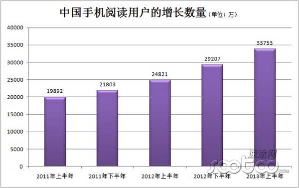 從中國手機閱讀用戶的增長數量圖表看,中國手機閱讀用戶的數量一直保持著良好的增長勢頭。2011年上半年中國手機閱讀用戶數為19892萬人,2012年上半年中國手機閱讀用戶數為24821萬人,環比增長24.7%,2013年上半年中國手機閱讀用戶數達33753萬人,環比增長35.9%。