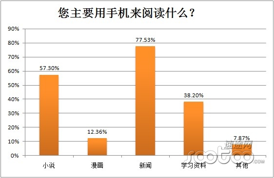 用戶主要用手機來閱讀什么內容呢?從上圖可以看到57.30%的用戶使用手機閱讀小說,12.36%的用戶使用手機閱讀漫畫,77.53%的用戶使用手機閱讀新聞,使用手機了解新聞信息的用戶數占比最多,使用手機及時獲取新聞咨詢是一種趨勢,另外還有38.20%的用戶通過手機閱讀學習資料。