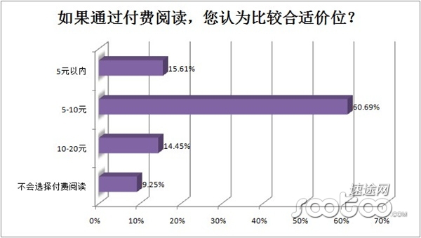 如果進行付費閱讀,用戶能接受的價位5-10元最多,比例為60.69%;15.61%的用戶只能接收5元以內的付費閱讀,也有9.25%的用戶不會接收付費閱讀?磥砀顿M閱讀的道路很難走,相關企業還需另謀出路。