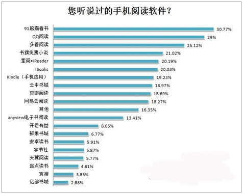 手機閱讀軟件已經非常多,那么用戶聽說過的手機閱讀軟件又是哪些呢?91熊貓看書排在第一位,30.77%的用戶聽說過,QQ閱讀排在第二位,29%的用戶聽說過;多看閱讀排在第三位,25.12%的用戶聽說過,其次還有掌閱iReader、iBooks、Kindle(手機應用)、云中書城、豆瓣閱讀等。