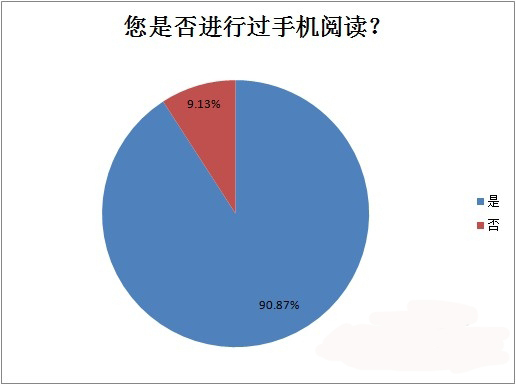 用戶是否進行過手機閱讀,通過調查我們發現大多數人都進行過手機閱讀,90.87%的手機用戶曾經有過手機閱讀的行為,且有很多用戶目前仍在進行手機閱讀。