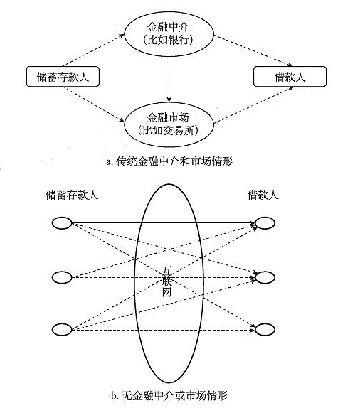 直觀的理解是,有M個資金供給者和N個資金需求者,兩邊通過各種金融中介和市場進行金額、期限、風險收益上的匹配,設想M和N趨于無窮大,并且金融中介和市場被互聯網替代。