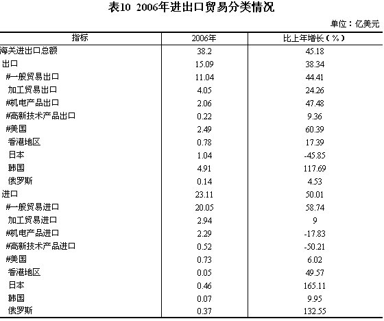 對外貿易快速增長。全年全省外貿進出口總值為38.20億美元,比上年增長45.18%,其中:出口總值為15.09億美元,增長38.34%;進口總值為23.11億美元,增長50.01%。一般貿易出口11.04億美元,增長44.41%;加工貿易出口4.05億美元,增長24.26%。機電產品出口2.06億美元,增長47.48%。高新技術產品出口0.22億美元,增長9.36%。