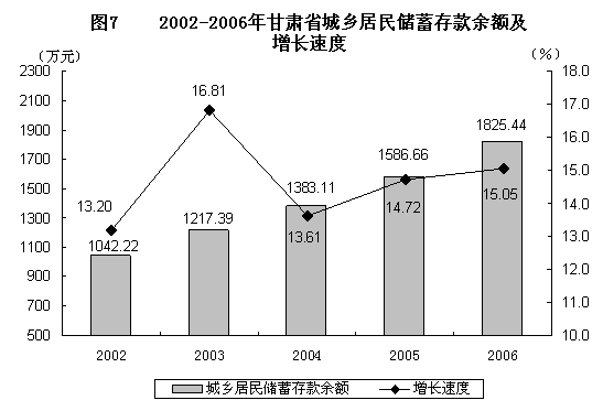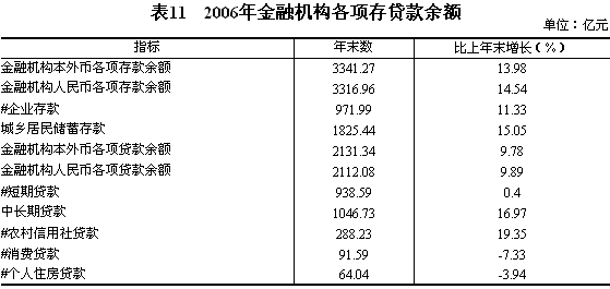 金融機構存貸款規模繼續擴大。年末,全省金融機構本外幣各項存款余額3341.27億元,比上年末增長13.98%。全省金融機構人民幣各項存款余額3316.96億元,增長14.54%,其中:企業存款余額971.99億元,增長11.33%;城鄉居民儲蓄存款余額1825.44億元,增長15.05%。年末全省金融機構本外幣各項貸款余額2131.34億元,比上年末增長9.78%。全省金融機構人民幣各項貸款余額2112.08億元,增長9.89%。