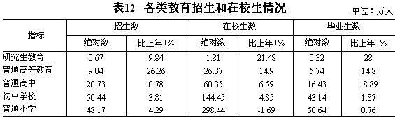 科技事業進一步發展。認定國家級企業(集團)技術中心5家,比上年增加3家。全年共取得省部級以上科技成果704項,比上年增加70項,其中:應用技術成果651項,軟科學成果53項。全年獲得獎勵177項。受理專利申請1460件,授權專利832件。技術交易穩步發展,全年共簽訂技術合同1995項,比上年增長6.29%;技術合同成交金額21.45億元,增長24.20%。 教育事業穩步推進。全省普通高等教育招生9.04萬人,比上年增長26.26%,在校學生26.37萬人,增長14.90%;研究生教育招生0.67萬人,增長9.84%,在學研究生1.81萬人,增長21.48%;普通高中招生20.73萬人,增長0.78%;初中學校招生50.44萬人,增長3.81%;普通小學招生48.17萬人,增長4.29%;特殊教育招生0.13萬人,在校學生0.91萬人。
