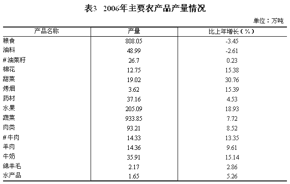 農業穩定發展。糧食種植面積為259.88萬公頃,比上年增長0.45%,全年糧食總產量達到808.05萬噸,下降3.45%。其中:夏糧總產339.12萬噸,增長0.33%;秋糧總產468.93萬噸,下降6.0%。