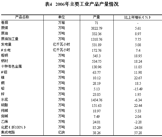 規模以上工業中,集體企業完成32.21億元,增長17.34%;外商及港澳臺企業完成21.65億元,增長18.21%;股份制企業完成432.87億元,增長16.72%。輕工業完成增加值114.59億元,增長9.54%;重工業完成增加值659.62億元,增長18.92%。 主要產品產量平穩增長。全年發電量531.89億千瓦小時,比上年增長5.08%;原煤3822.79萬噸,增長5.61%;原油332.36萬噸,增長8.97%;原油加工量1310.76萬噸,增長7.75%。粗鋼產量545.30萬噸,增長18.95%;鋼材534.75萬噸,增長18.24%;水泥1454.76萬噸,下降6.34%;十種有色金屬130.96萬噸,增長11.05%。